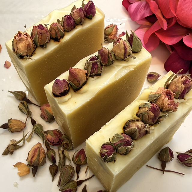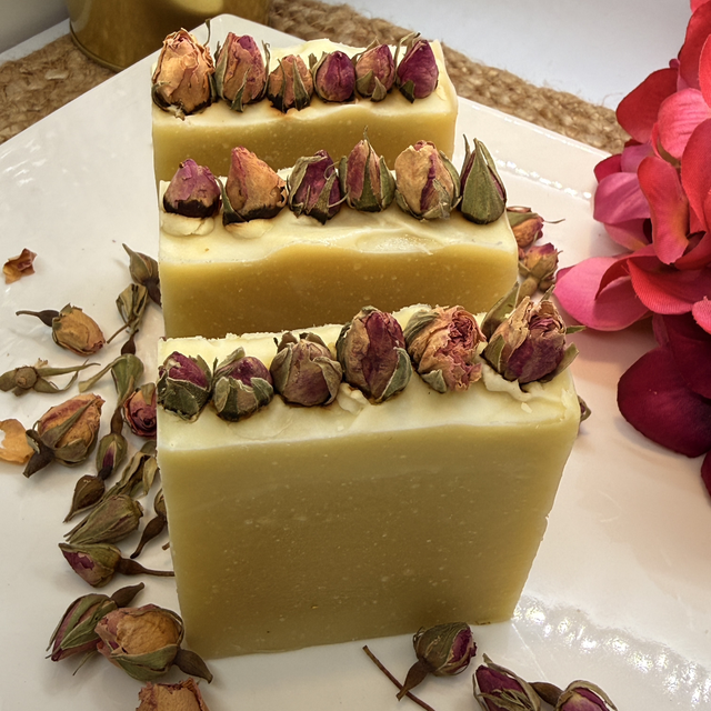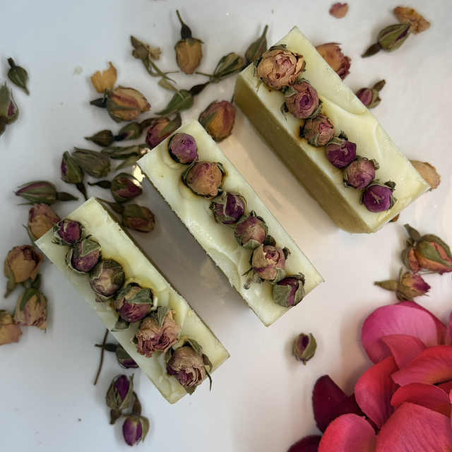 SOBRE: Este sabonete é uma celebração do cuidado profundo, unindo a leveza do óleo de côco à regeneração do óleo de rosa mosqueta e à riqueza nutritiva do óleo de rícino. A manteiga de Karité proporciona suavidade e conforto, deixando a pele flexível e luminosa. O óleo essencial de gerânio rosa eleva a experiência com o seu perfume floral equilibrante, conhecido pelas suas propriedades harmonizadoras. Os botões de rosa acrescentam beleza, textura e uma vibração romântica que evoca pureza e renascimento. O resultado é um sabonete regenerador, feminino e profundamente indulgente.